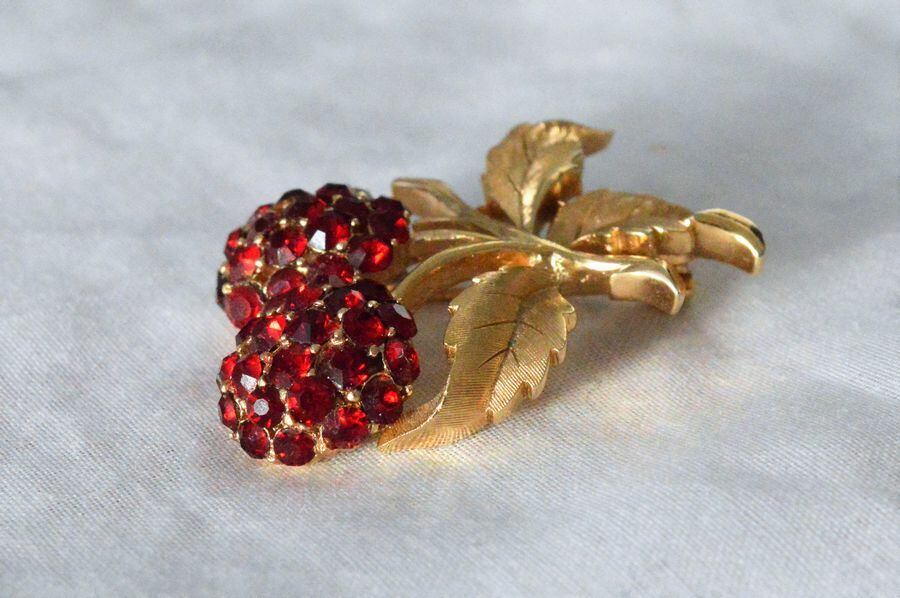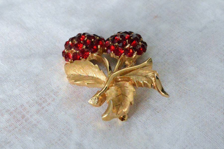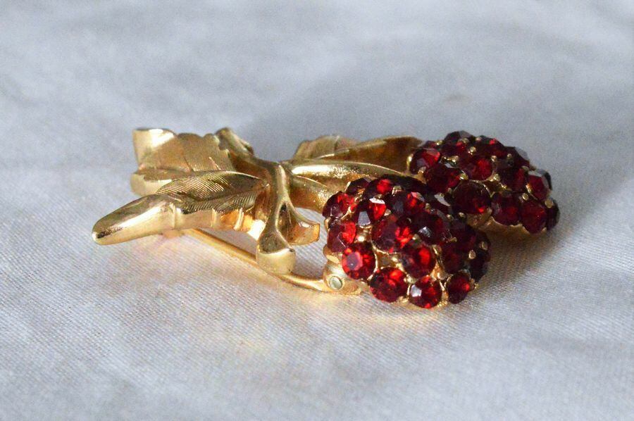 イエローゴールドカラーをベースに真っ赤なラインストーンをセットし、チェリーをモチーフにしたブローチになります。